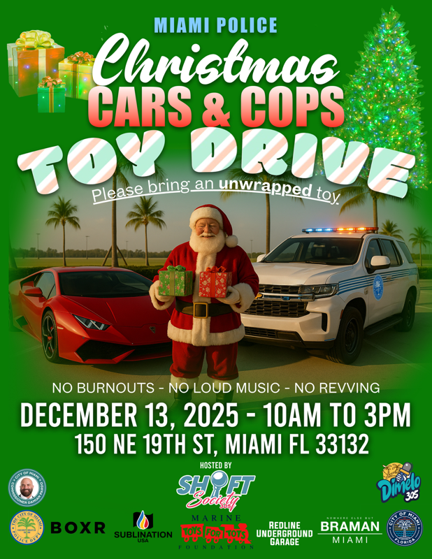 Miami Police Department invites you in TOY DRIVE on December 13,2025 between 10:00 AM and 3:00 PM. Click on the flyer for more info.